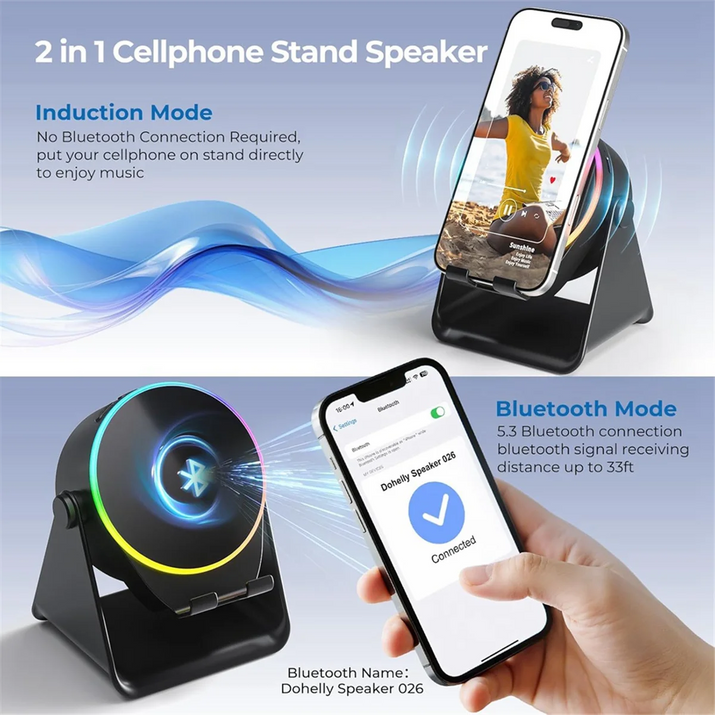 Answer 1: Just place your phone on the stand. The speaker instantly amplifies your audio with clear, powerful sound—no pairing needed.